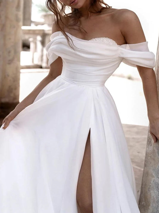 Simple A-Line Beach Wedding Dresses Off The Shoulder Pleated Beads Satin Sweep Train Bridal Gowns With Slit