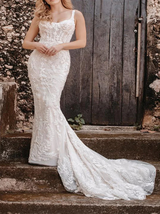Gorgeous Mermaid Wedding Dresses Spaghetti Appliqued Beads Sleeveless Tulle Sweep Train Bridal Gowns Custom With Detachable Sweep Train