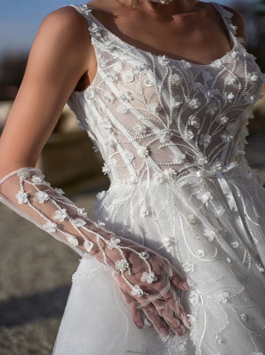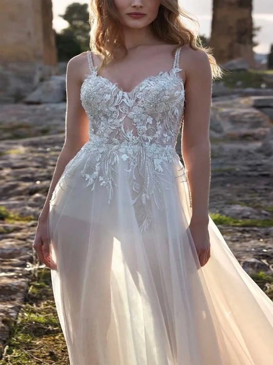 Elegant & Gorgeous A-Line Wedding Dresses Spaghetti Appliqued Tulle Sweep Train Bridal Gowns