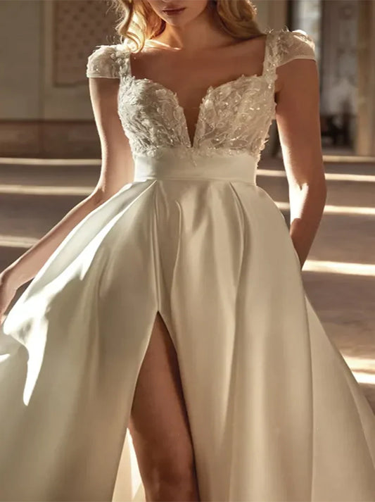 Gorgeous A-Line Beach Wedding Dresses Sweetheart Appliqued Cap Sleevels Satin Sweep Train Bridal Gowns With Slit