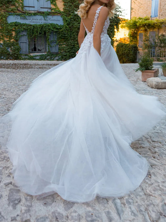 Elegant & Gorgeous A-Line Wedding Dresses V-Neck Appliqued Tulle Sweep Train Bridal Gowns