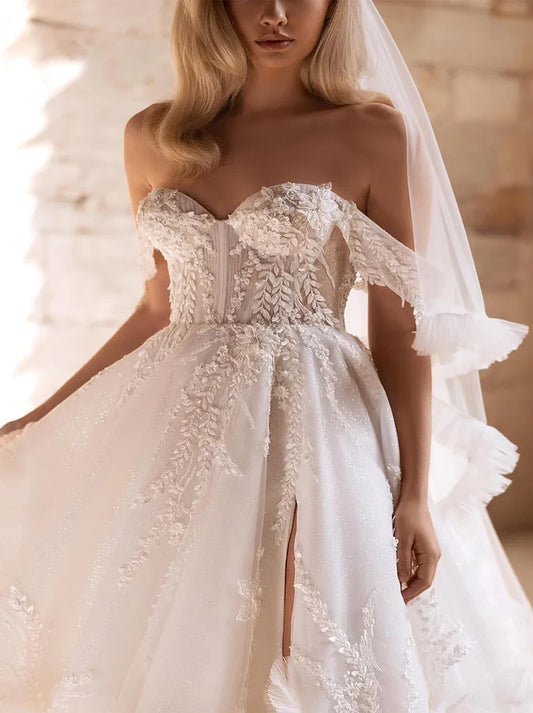 Elegant & Gorgeous A-Line Wedding Dresses Sweetheart Ruffles Appliqued Tulle Sweep Train Bridal Gowns With Slit