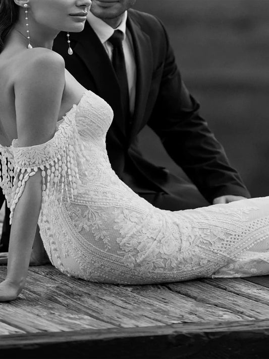 Gorgeous Mermaid Wedding Dresses Off TheShoulder Appliqued Tassels Tulle Sweep Train Bridal Gowns Custom Made