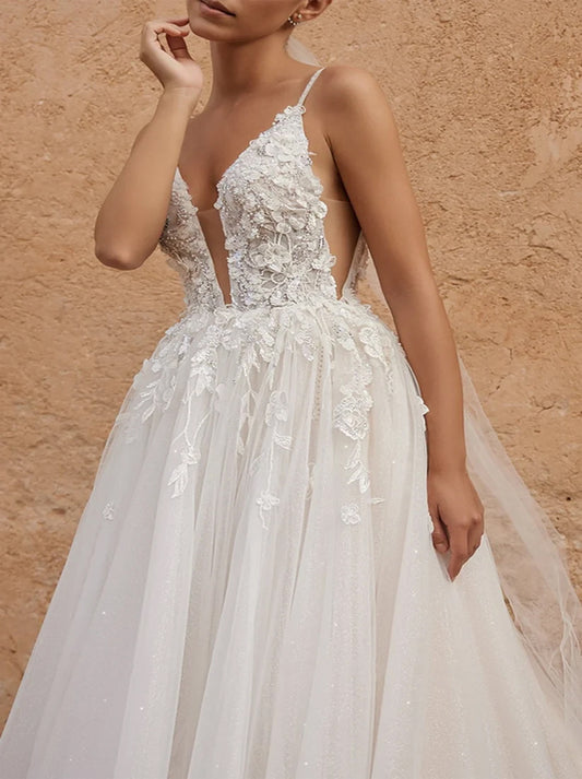 Elegant & Gorgeous A-Line Wedding Dresses Spaghetti Appliqued Beads Tulle Train Bridal Gowns Custom