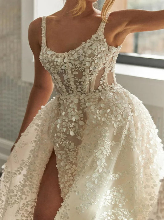 Elegant & Gorgeous A-Line Wedding Dresses Spaghetti Appliqued Tulle Train Bridal Gowns With Slit