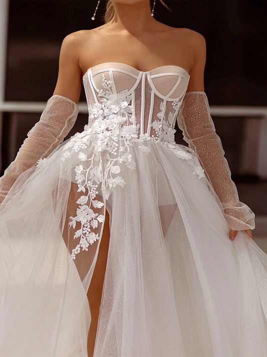 Simple A-Line Beach Wedding Dresses Sweetheart Appliqued Tulle Sweep Train Bridal Gowns With Slit