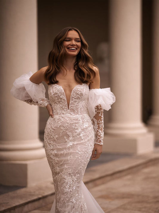 Gorgeous Mermaid Wedding Dresses Sweetheart Sequins Appliqued Detachable Long Sleeves Tulle Sweep Train Bridal Gowns Custom Made