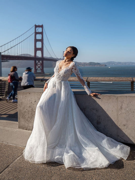Elegant A-Line Wedding Dresses V-Neck Beads Appliqued Long Sleeves Tulle Court Train Bridal Gowns Custom Made