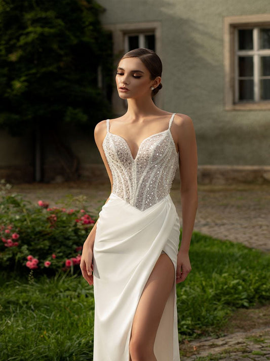 Sexy Mermaid Wedding Dresses Spaghetti Beads Sequins Satin Sweep Train Bridal Gowns Custom With Slit