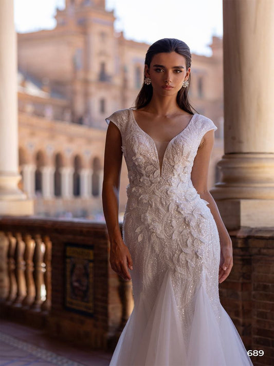 Gorgeous Mermaid Wedding Dresses V-Neck Beads Appliqued Cap Sleeves Tulle Sweep Train Bridal Gowns Custom Made