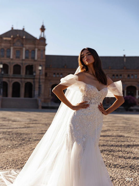 Gorgeous Mermaid Wedding Dresses Sweetheart Beads Appliqued Detachable Sleeves Tulle Sweep Train Bridal Gowns Custom Made