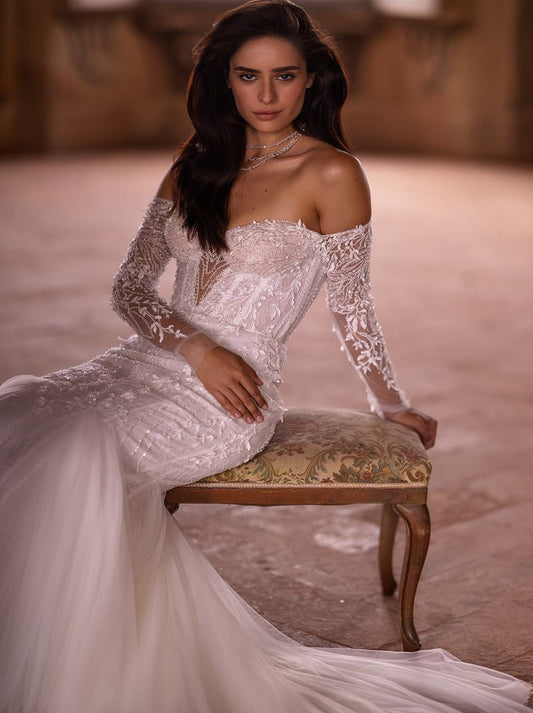 Gorgeous Mermaid Wedding Dresses Strapless Beads Appliqued Long Sleeves Tulle Court Train Bridal Gowns Custom Made
