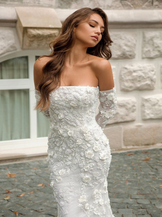 Modern Mermaid Wedding Dresses Scoop Beads Appliqued Long Sleeves Satin Sweep Train Bridal Gowns Custom Made