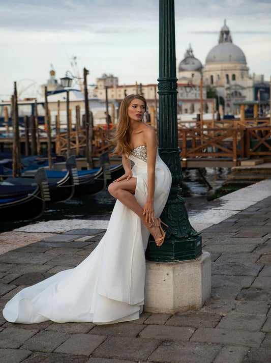 Elegant A-Line Wedding Dresses Sweetheart Beads Crystals Satin Sweep Train Bridal Gowns With Slit