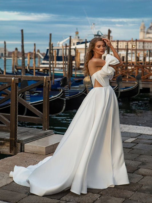 Simple A-Line Wedding Dresses Sweetheart Pleated Bowknot Satin Sweep Train Bridal Gowns With Slit